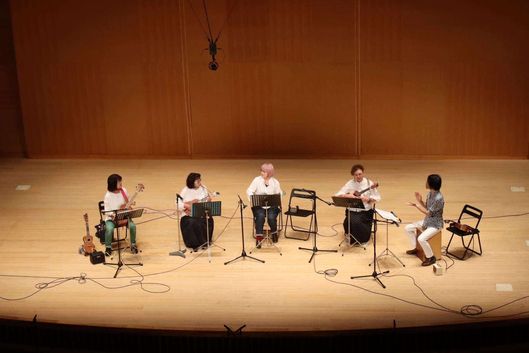 トリを飾ったのは札幌を拠点に大活躍中のウクレレアンサンブルチーム「レレピリカ」さん。仲良し4人組に、恩師である清水先生のカホンも加わり、いつも以上にパワフルで楽しい舞台を演出してくれました。第九合奏を控えて、会場の皆さんが参加できる「もみじ」の合奏などで盛り上げてくださいました!